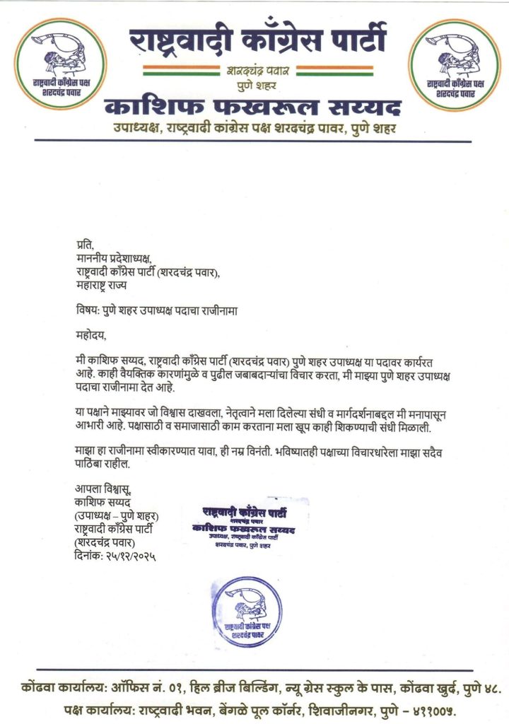 काशिफ सय्यद यांनी दिलेल्या राजीनाम्याचे कारण स्पष्ट करताना सांगितले की, “प्रभाग १९ कोंढवा–कौसरबागमध्ये दोन्ही राष्ट्रवादी गटांची युती ही कार्यकर्त्यांच्या भावना आणि स्थानिक राजकीय वास्तवाशी विसंगत आहे.” या निर्णयामुळे अनेक कार्यकर्त्यांमध्ये अस्वस्थता पसरली आहे.