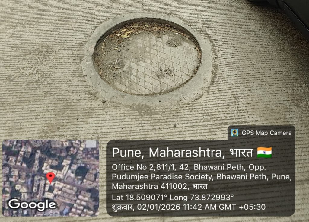भवानिपेठ मोटार स्टँड ते आलंकार चौक मार्गावर, कुमार गॅलेक्सी सोसायटीसमोर रस्त्याचे काँक्रीटचे काम करण्यात आलेल्या रस्त्याला अवघा एक महिनाही पूर्ण झालेला नसताना ड्रेनेज लाईनचे झाकण (मॅनहोल कव्हर) खचल्याचा धक्कादायक प्रकार समोर आला आहे. या घटनेमुळे संबंधित ठेकेदाराच्या कामाच्या दर्जावर गंभीर प्रश्नचिन्ह निर्माण झाले आहे.
