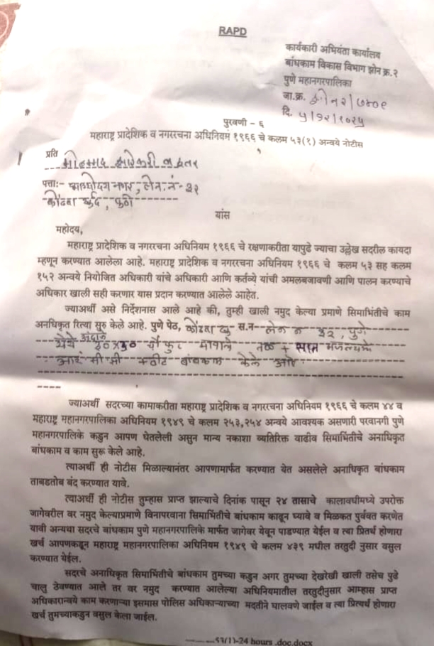 कोंढवा भाग्योदय नगर येथील अल्फलाह मशीद परिसरात सुरू असलेल्या अनधिकृत बांधकामावर PMC कडून नोटीस देण्यात आली असतानाही संबंधित बिल्डरने कारवाईला उघडपणे धुडकावले आहे.
